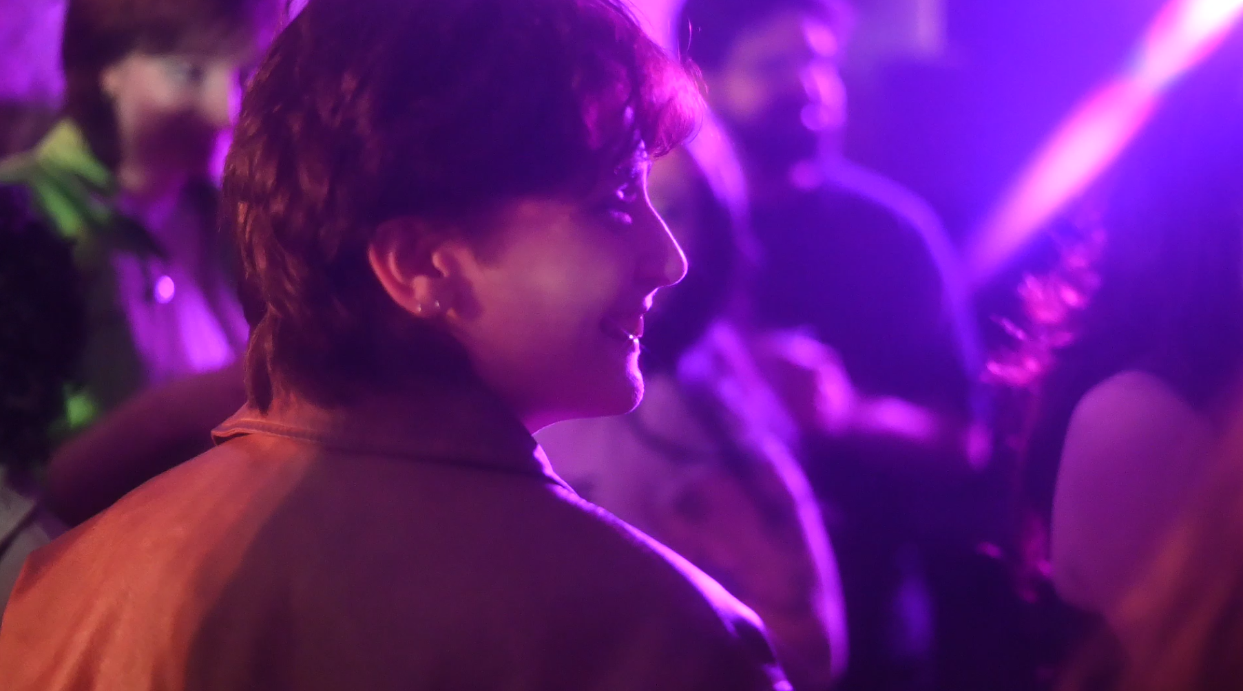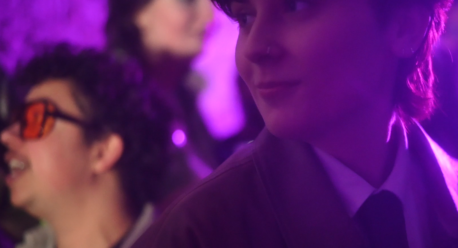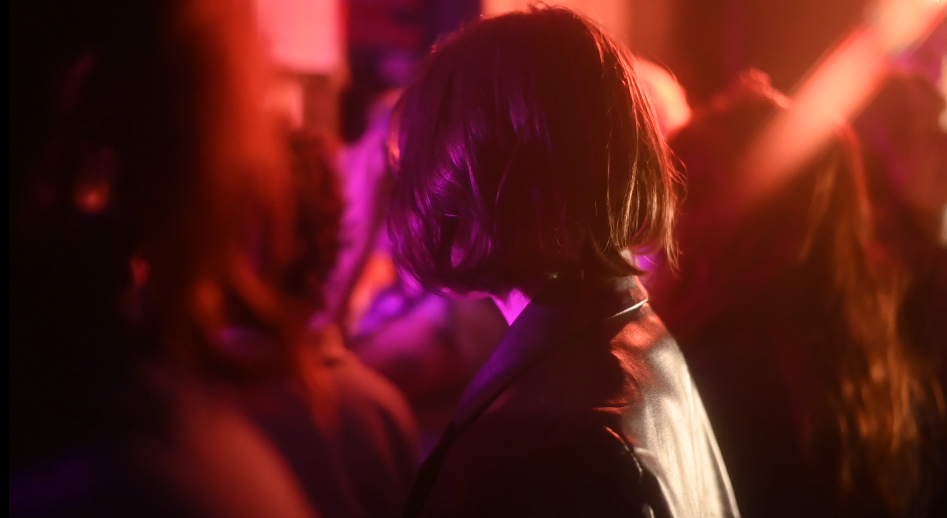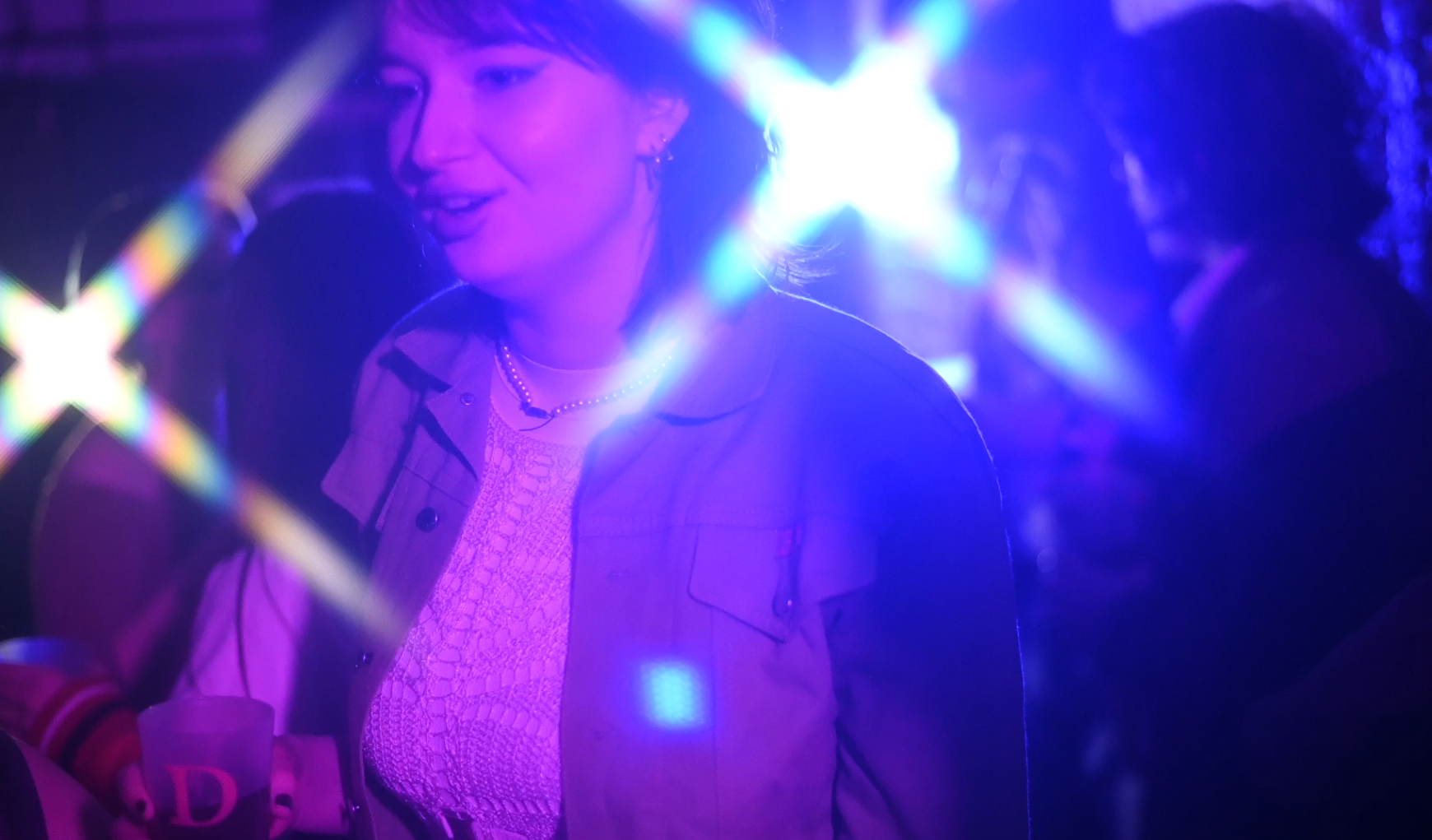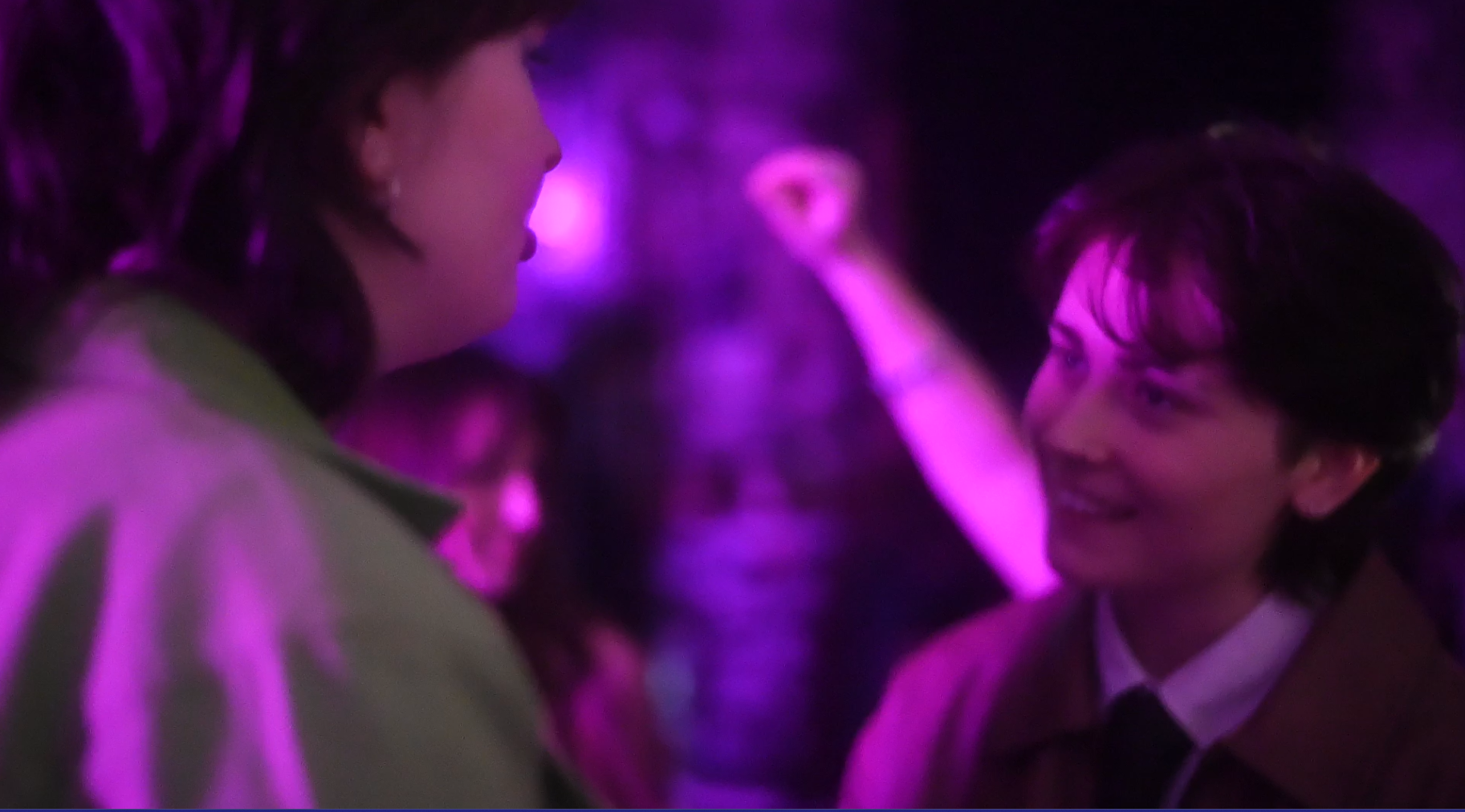 Moving on to the club scene where the two characters meet each other, I wanted the lighting to reflect the two characters. We started the scene with pinks and purples and shifted to pink and orange. We used a wash light and two battery powered RGB lights, one of them with a strobe effect, to achieve the desired look. During the filming process, we focused on capturing the overall atmosphere, shots of the crowd, and interactions between the two characters.