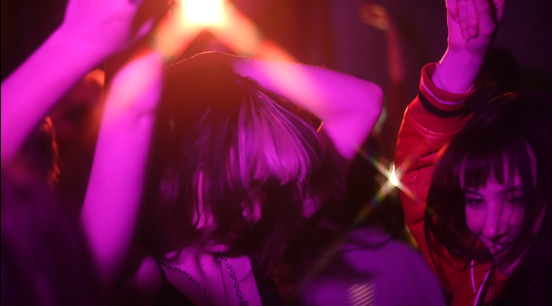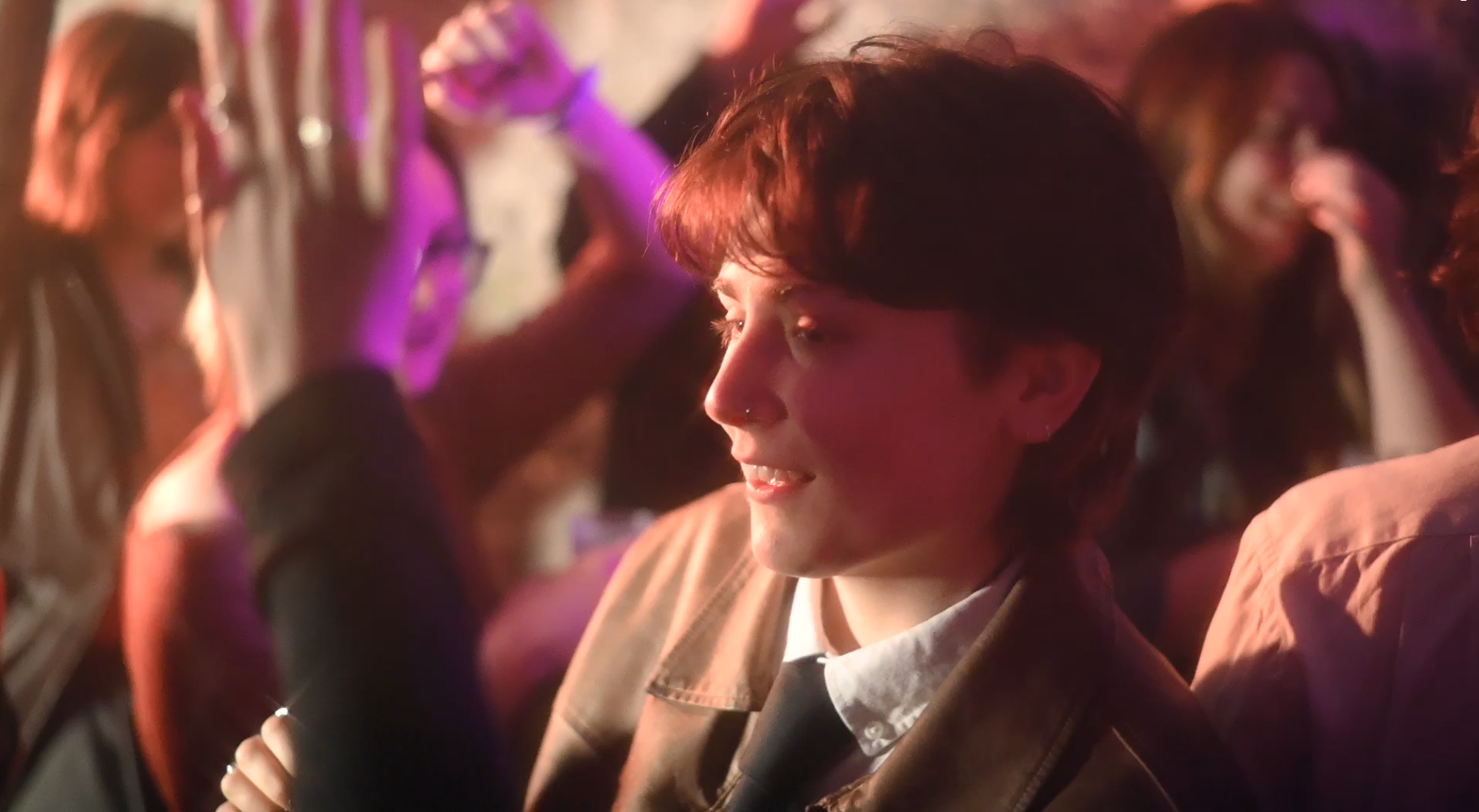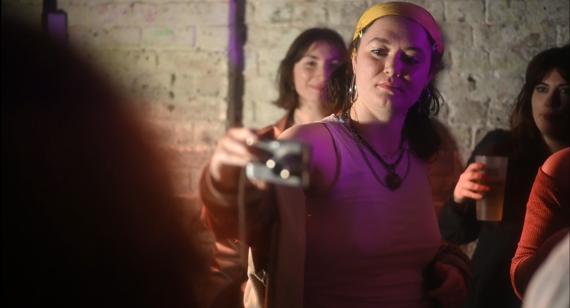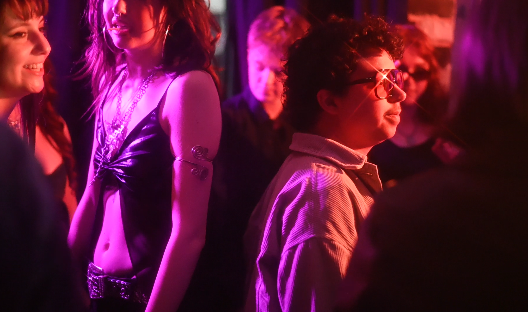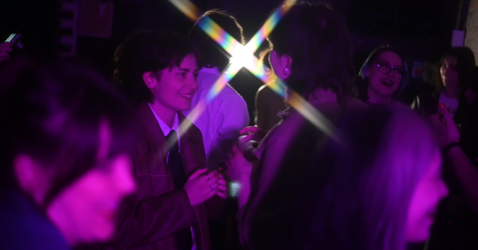 Moving on to the club scene where the two characters meet each other, I wanted the lighting to reflect the two characters. We started the scene with pinks and purples and shifted to pink and orange. We used a wash light and two battery powered RGB lights, one of them with a strobe effect, to achieve the desired look. During the filming process, we focused on capturing the overall atmosphere, shots of the crowd, and interactions between the two characters.