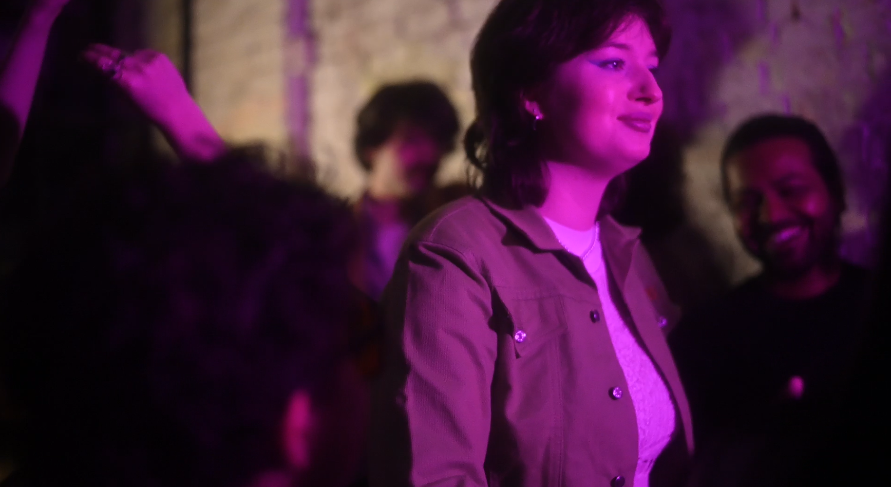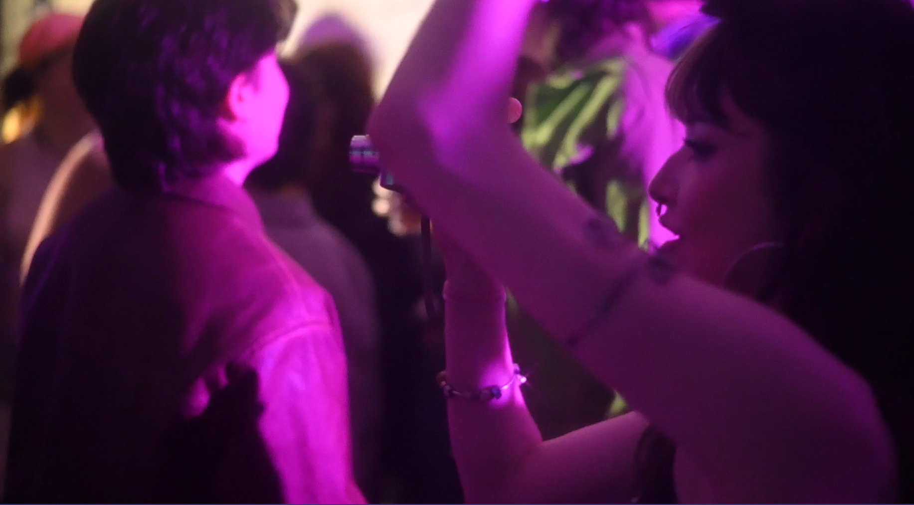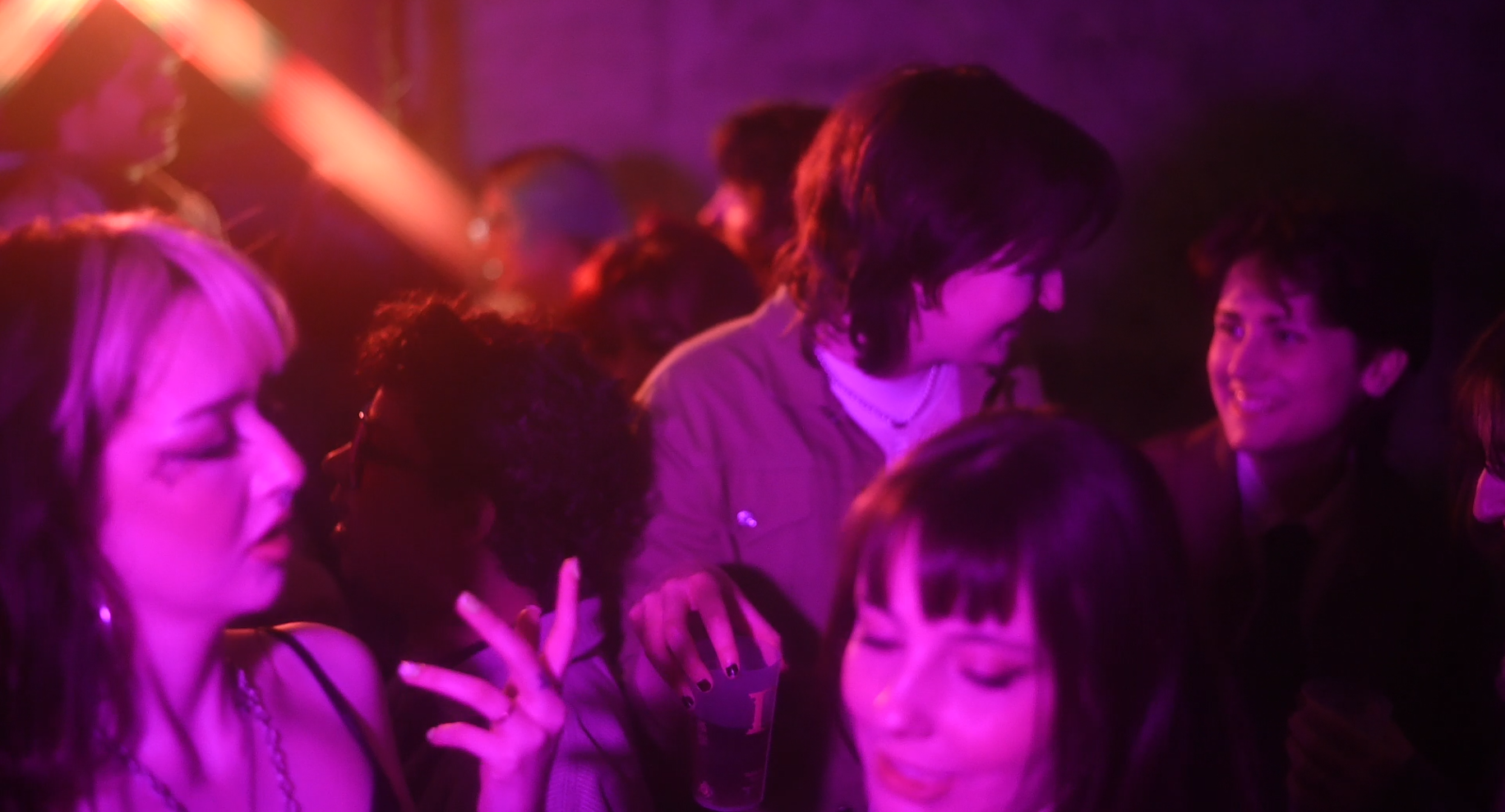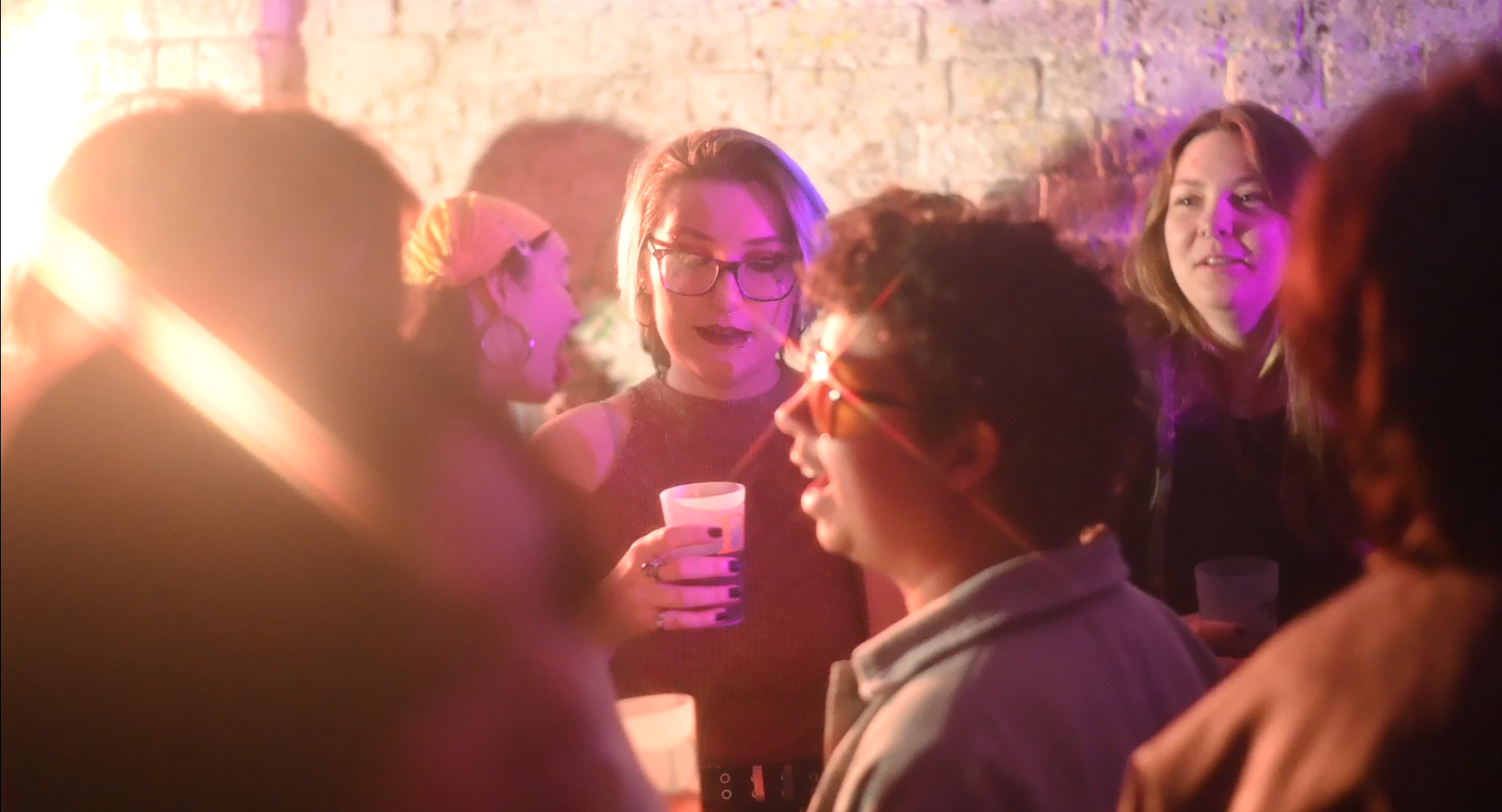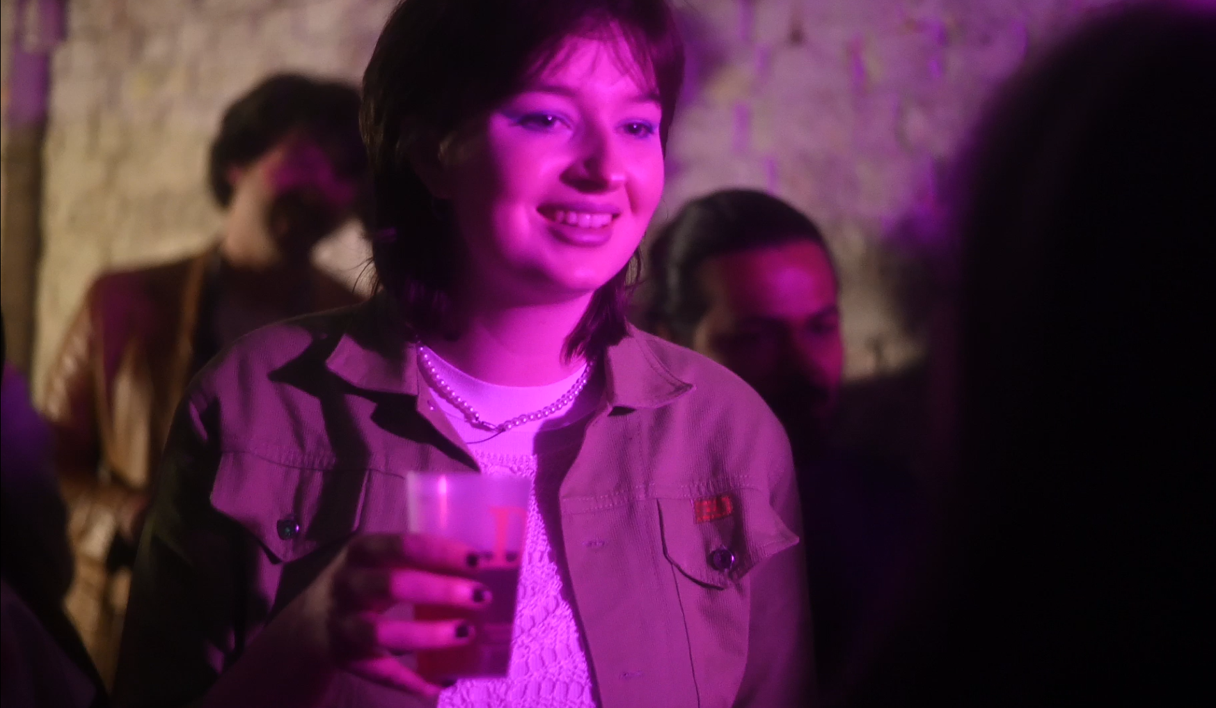 Moving on to the club scene where the two characters meet each other, I wanted the lighting to reflect the two characters. We started the scene with pinks and purples and shifted to pink and orange. We used a wash light and two battery powered RGB lights, one of them with a strobe effect, to achieve the desired look. During the filming process, we focused on capturing the overall atmosphere, shots of the crowd, and interactions between the two characters.