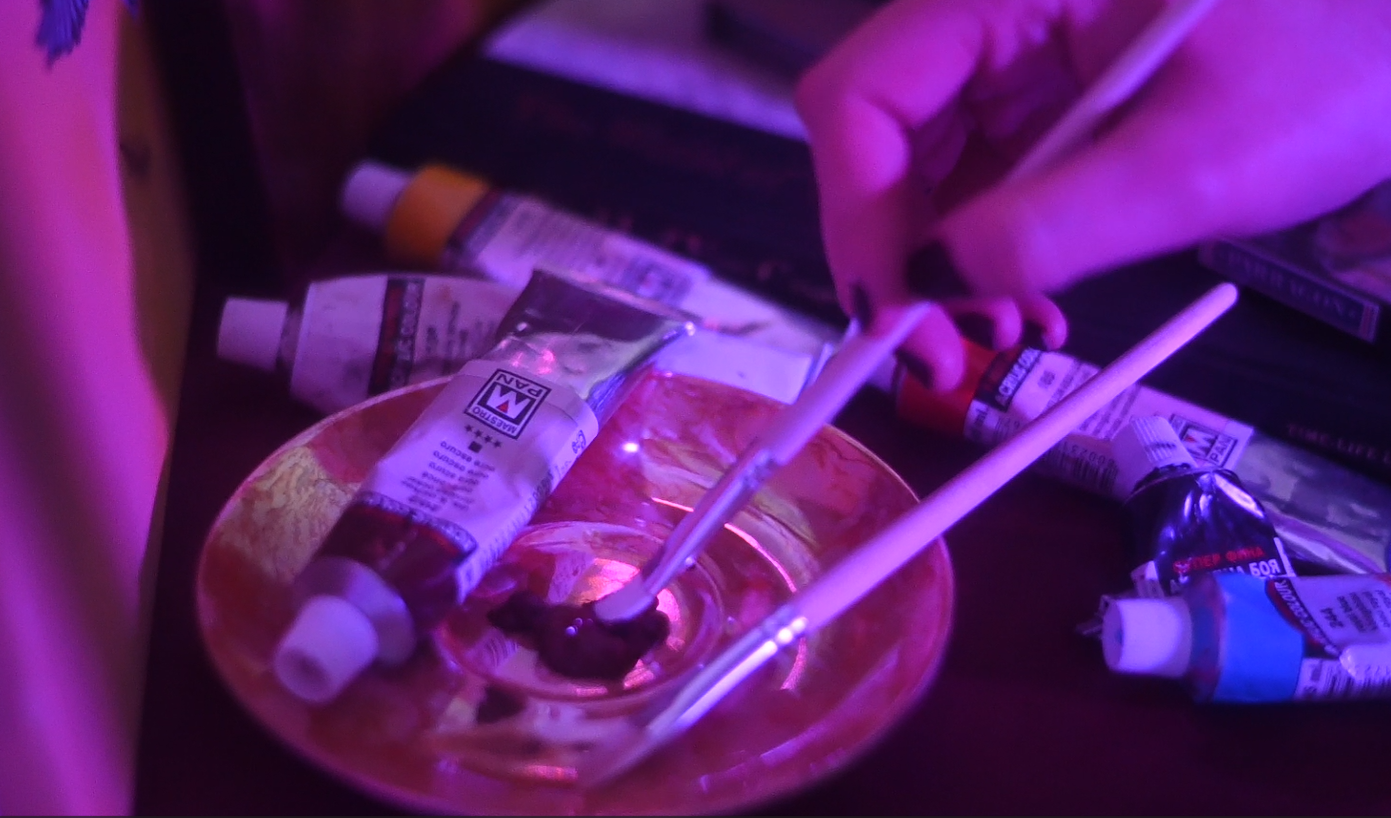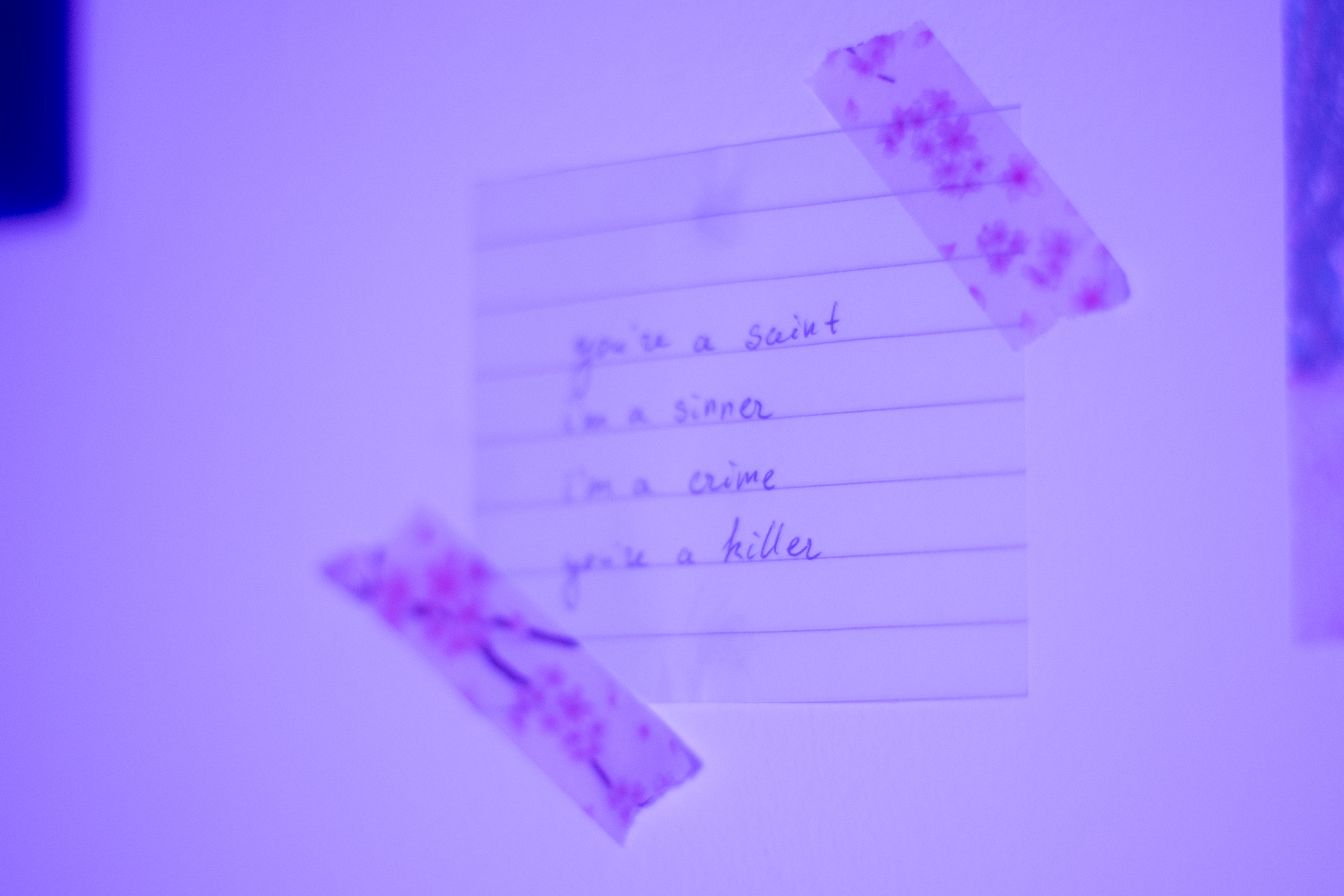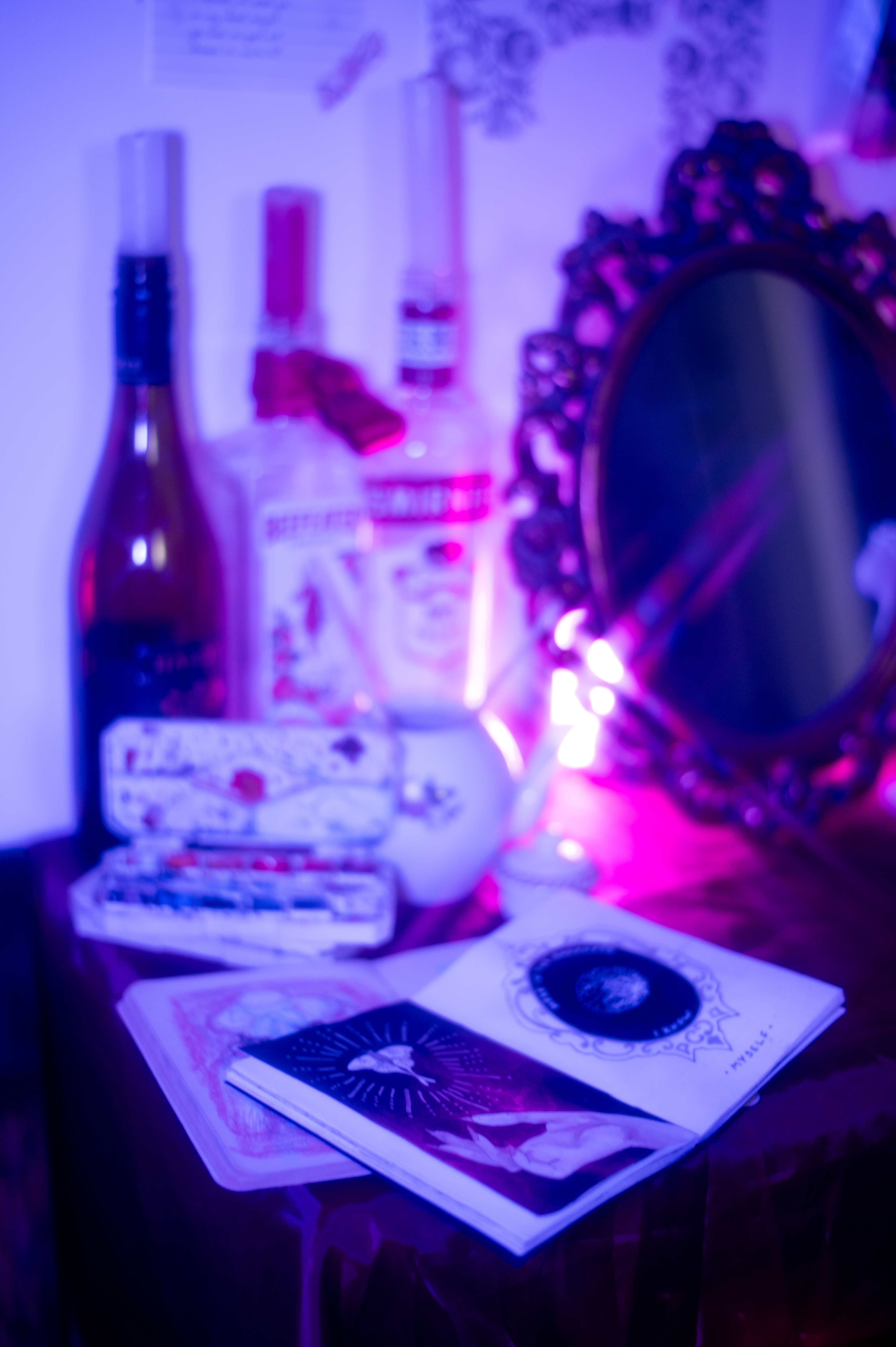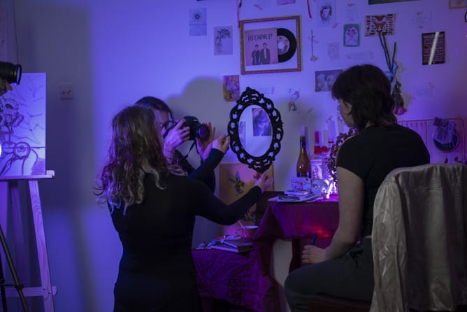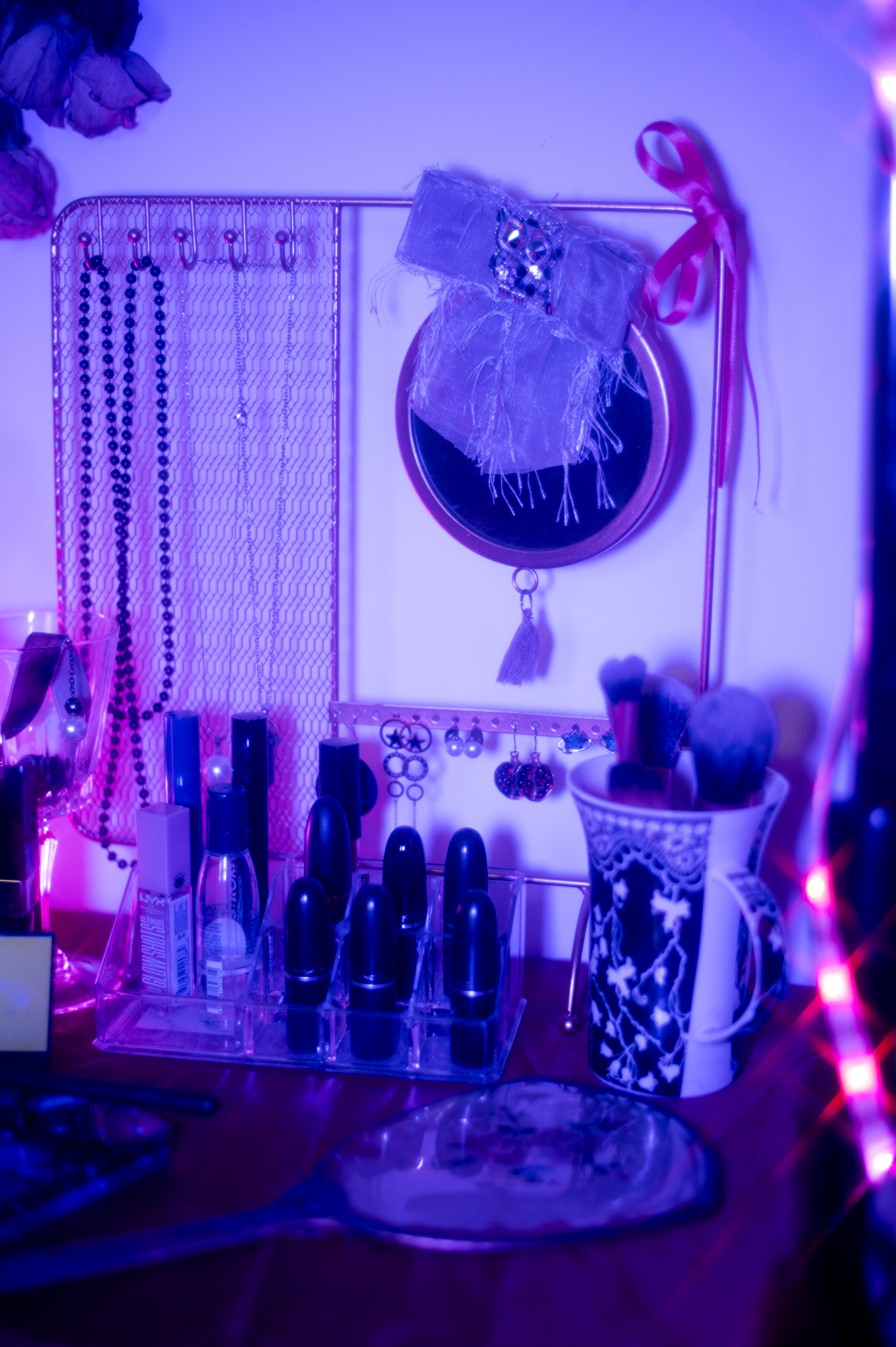 I built the set from skratch in my photography and film studio. I started by adding some hand-drawn pieces on the wall. dry roses hanging upside down, handwritten quotes from the song lyrics. I made a vinyl sleeve for “Hey Honey!” that I added on the wall. I also made an abstract neon sign using el wire. Then I added the dressing table, sketchbooks, paints, make-up, easel, and gathered the rest of the props. Special thanks to Marielle Serbest for providing the beautiful paintings for the set!