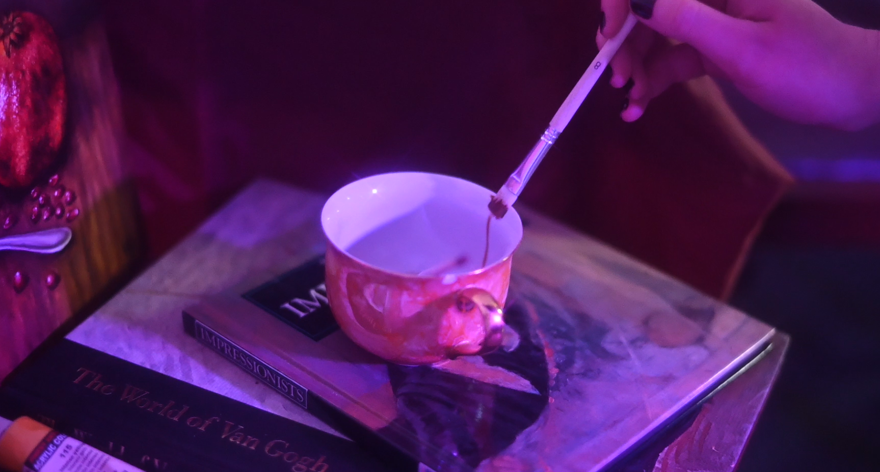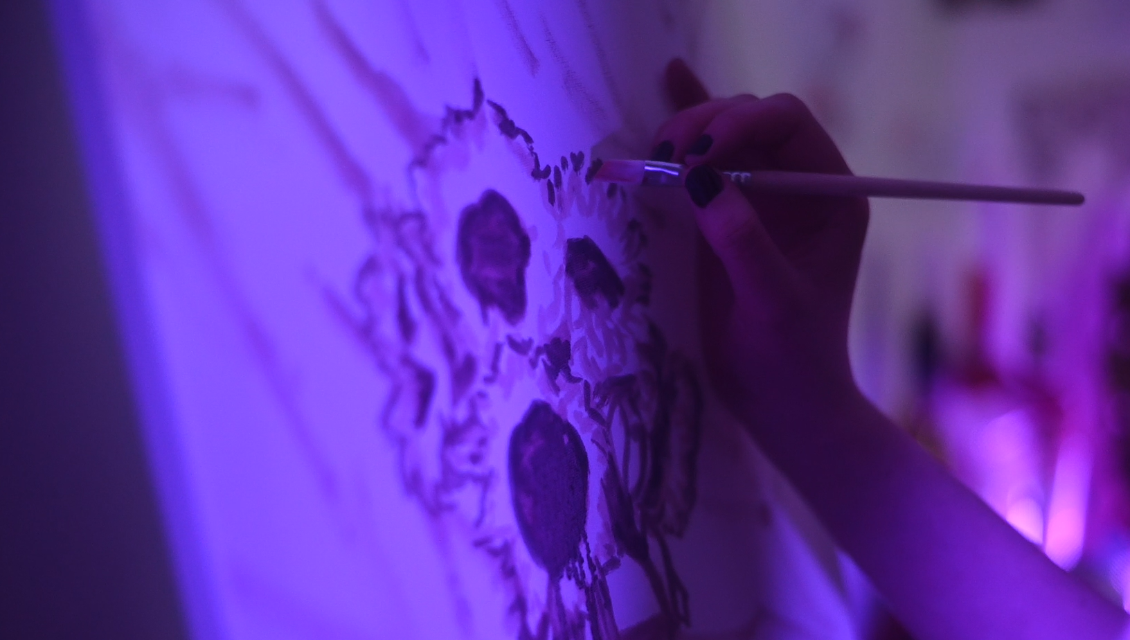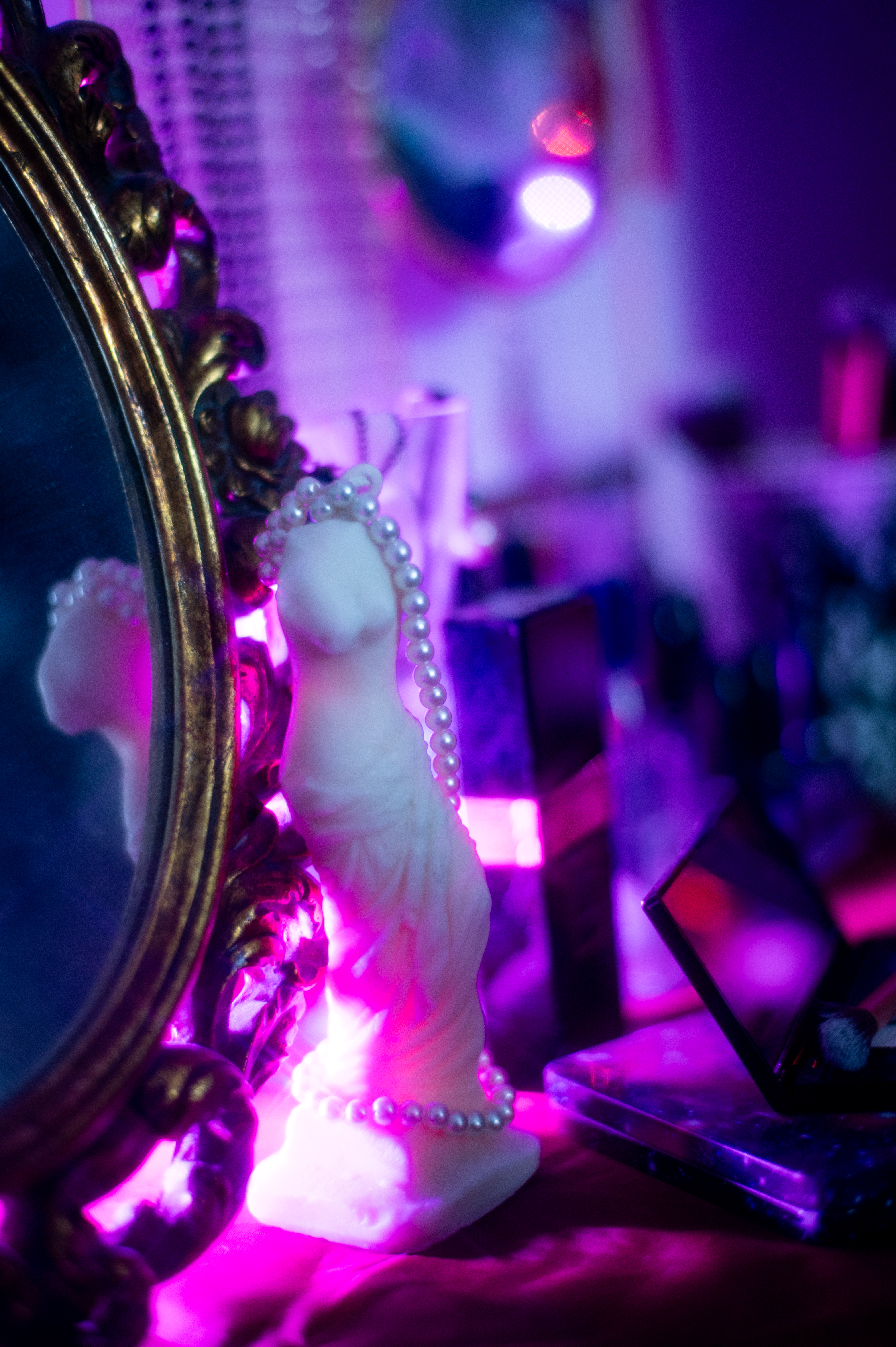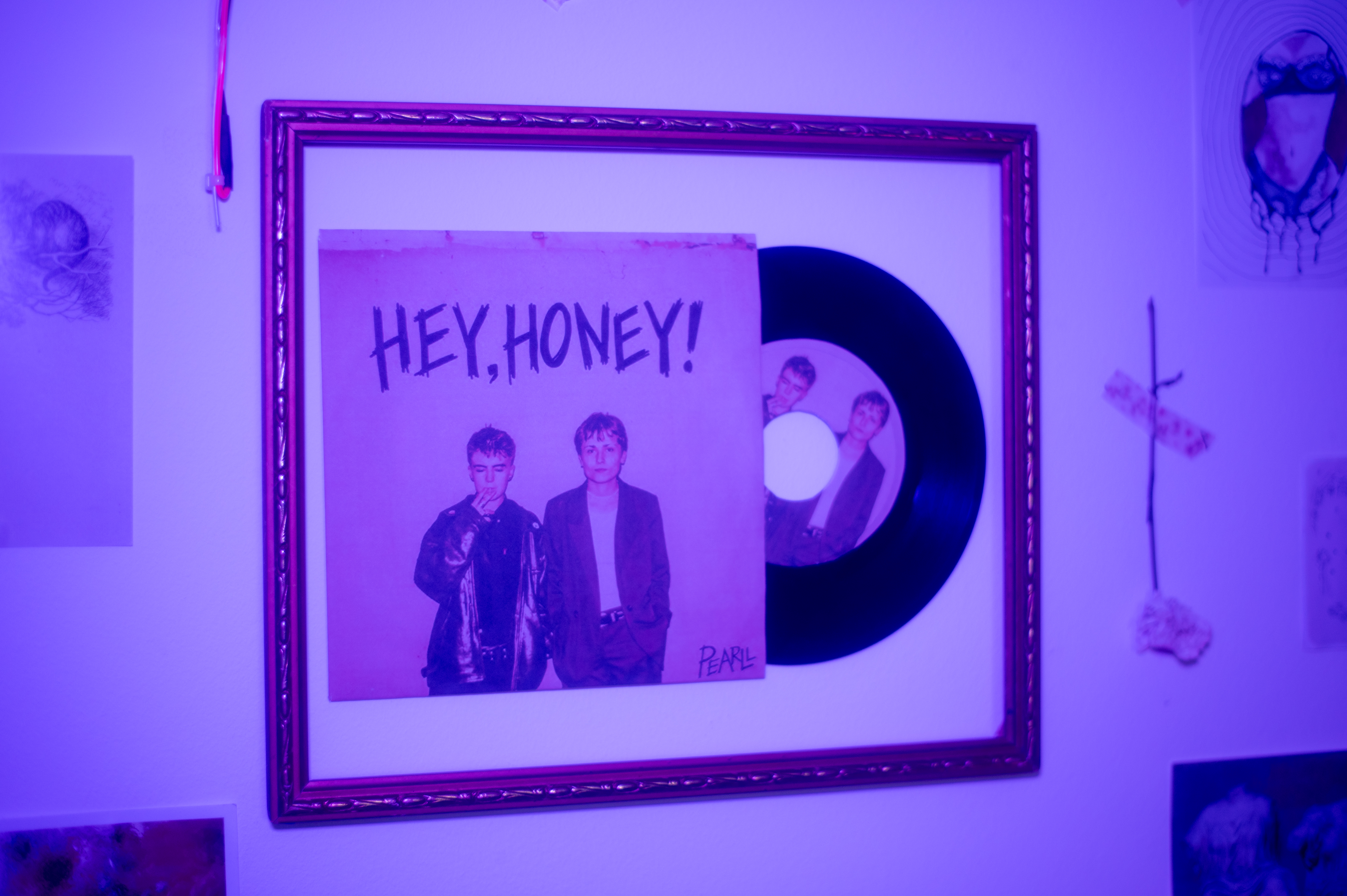 I built the set from skratch in my photography and film studio. I started by adding some hand-drawn pieces on the wall. dry roses hanging upside down, handwritten quotes from the song lyrics. I made a vinyl sleeve for “Hey Honey!” that I added on the wall. I also made an abstract neon sign using el wire. Then I added the dressing table, sketchbooks, paints, make-up, easel, and gathered the rest of the props. Special thanks to Marielle Serbest for providing the beautiful paintings for the set!