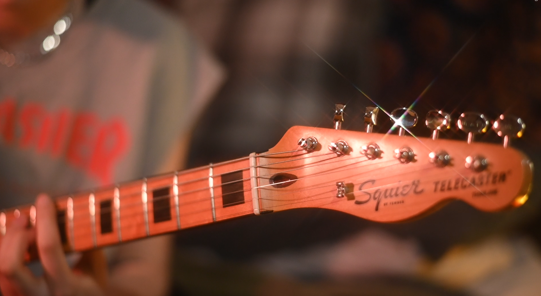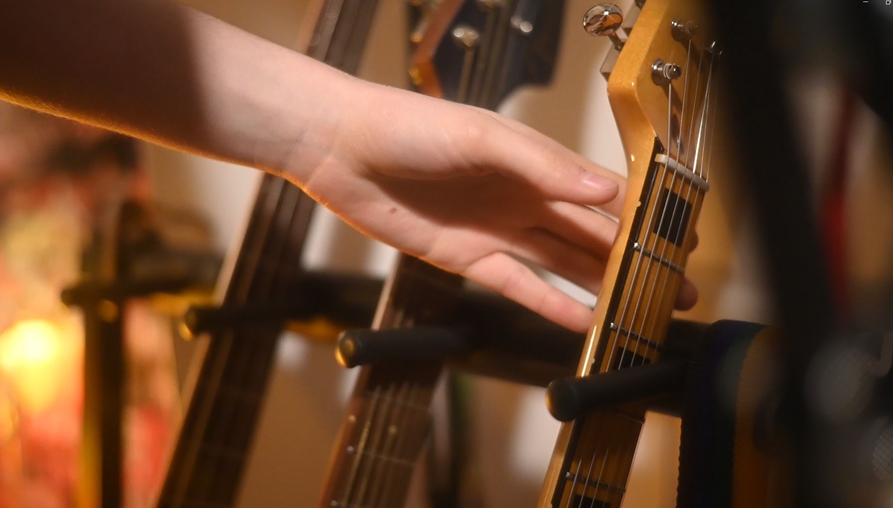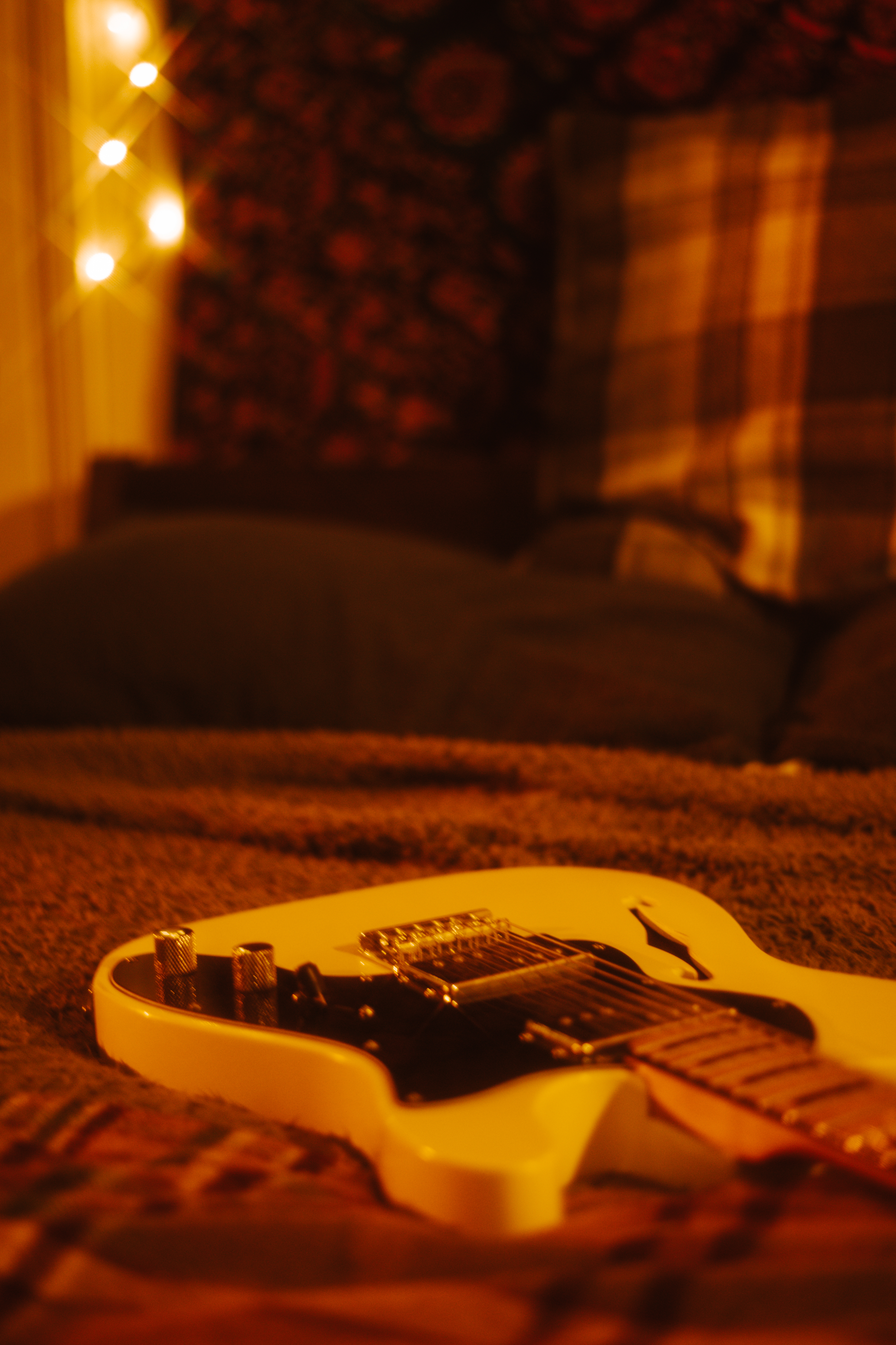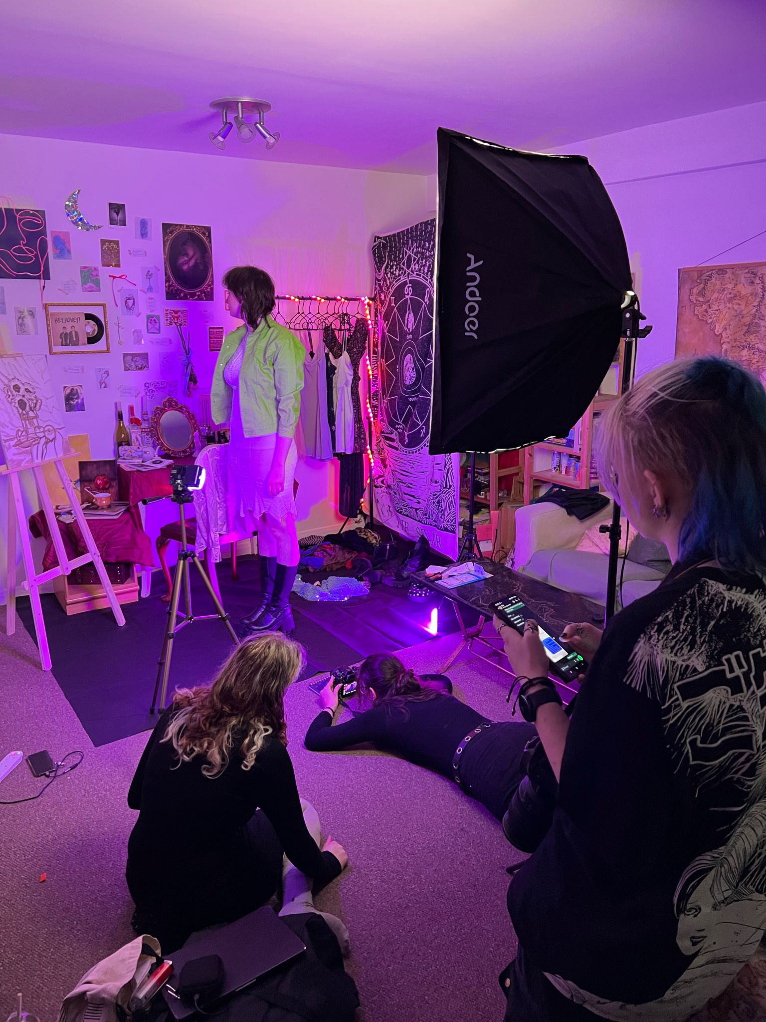 We kept Chloe’s bedroom as it is - with the band posters, tapestry, guitars, etc., lit it in warm toned lighting and added fairy lights and a sunset lamp to complete the mood. We chose clothing from her wardrobe, and kept her look natural.