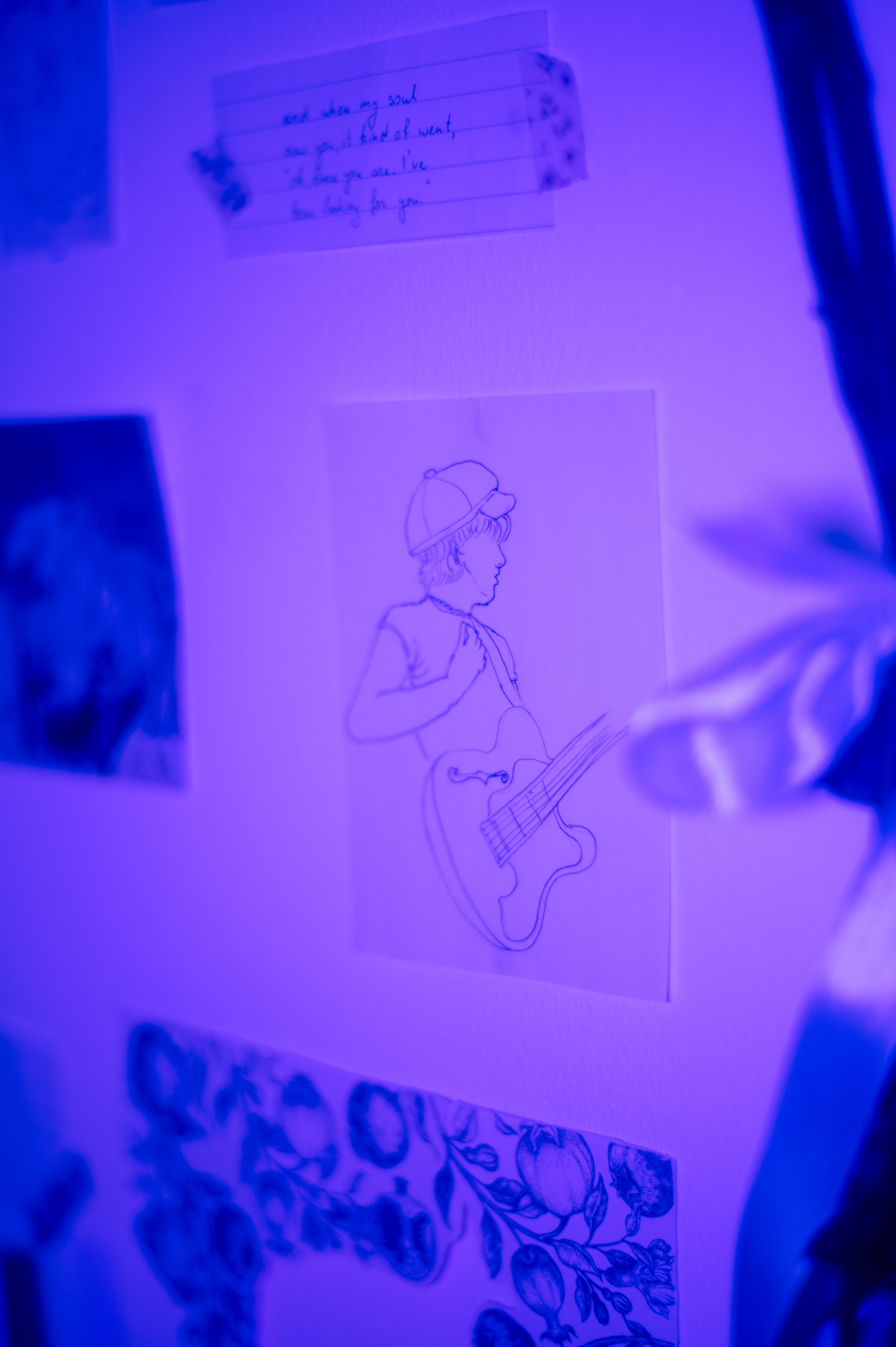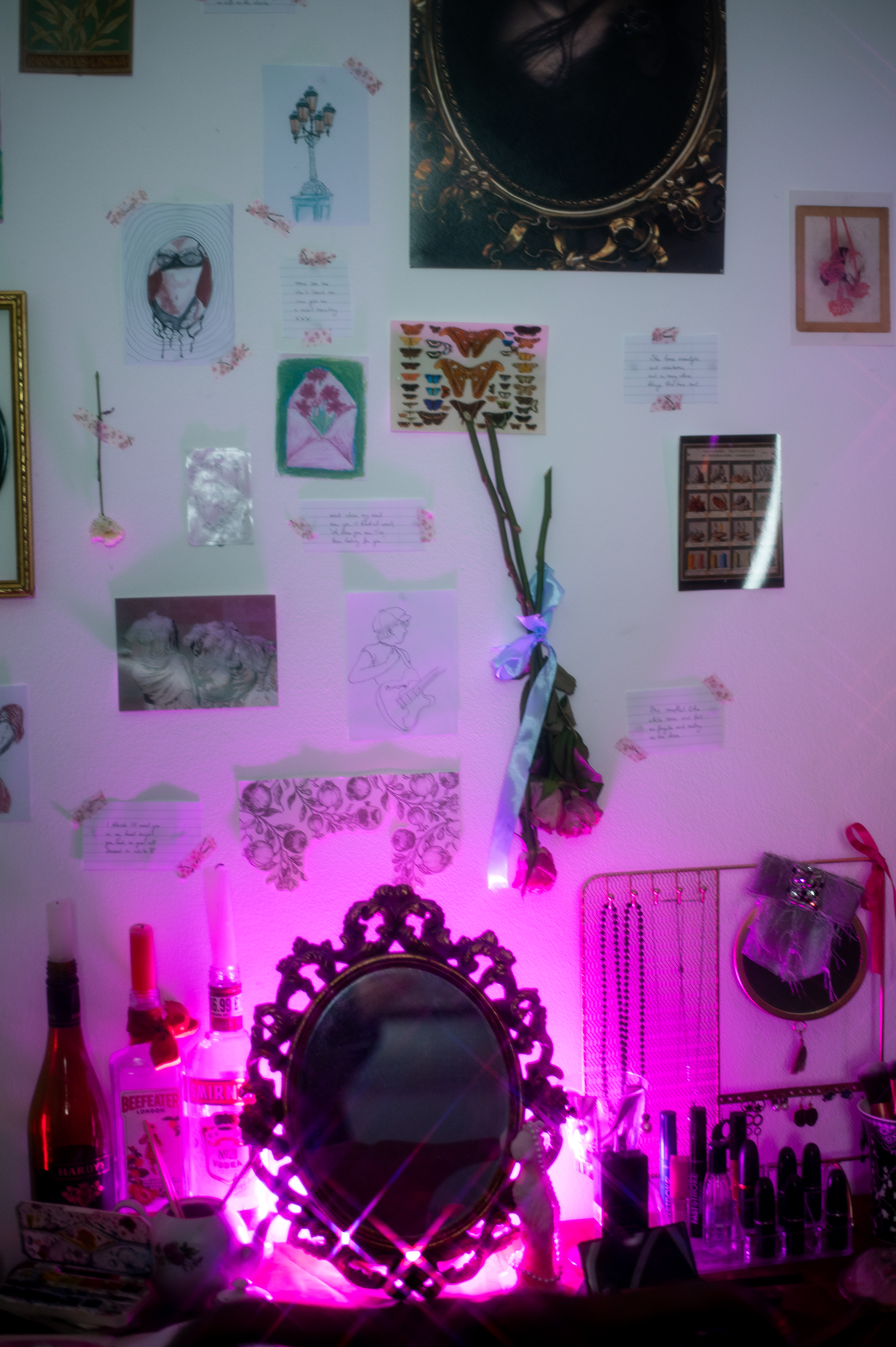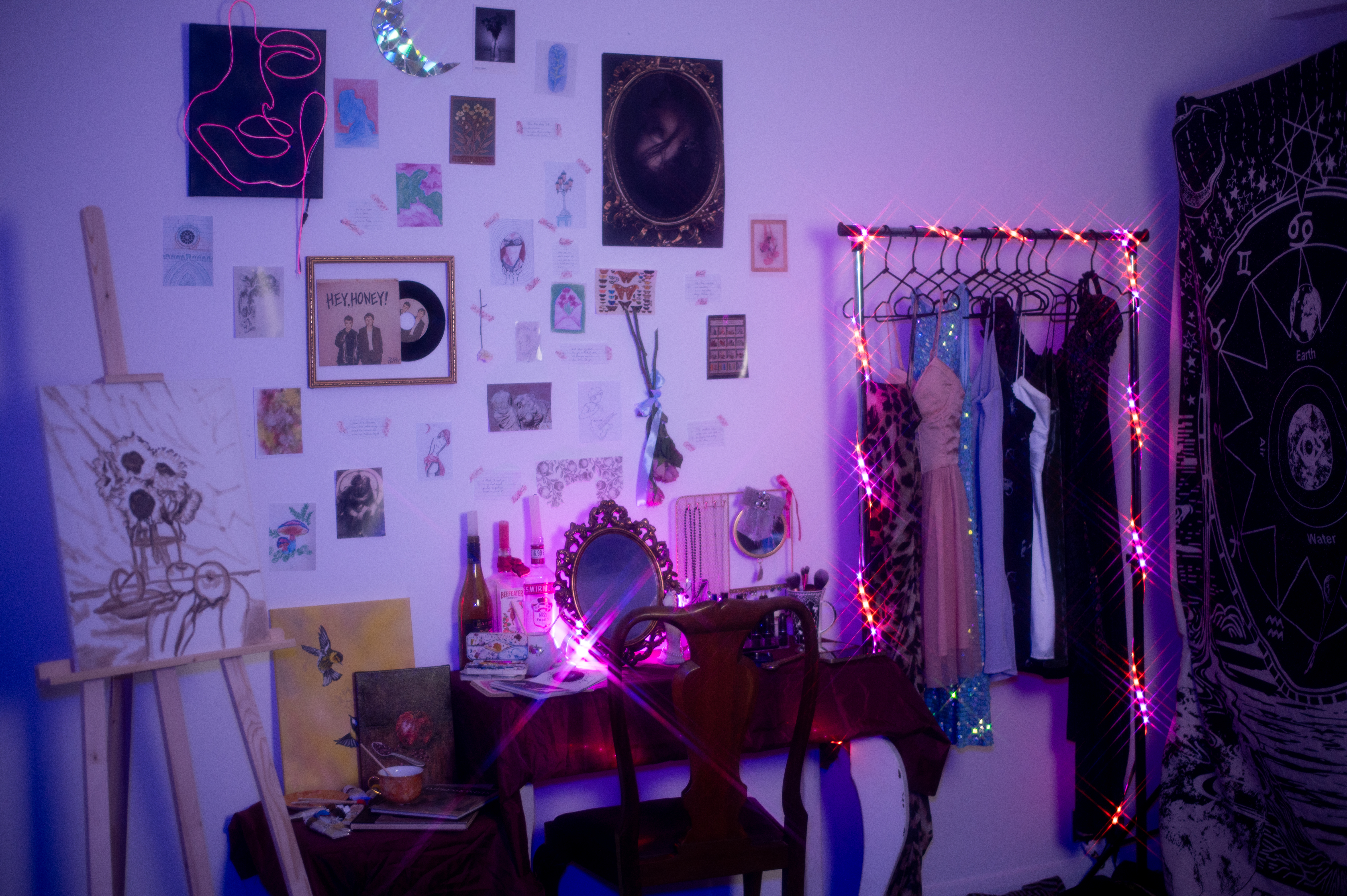 Her bedroom walls have drawings on the walls, tapestry above the bed, paintings on canvans on the floor, a vinyl collection (Including Hey, Honey by Pearll), candles in bottles, sketchbooks, flowers hanging upside down on the walls, vanily table that also serves as a desk because why not, scattered watercolour pallets mixed with eyeshadow pallets. She is the Art and the Artist.