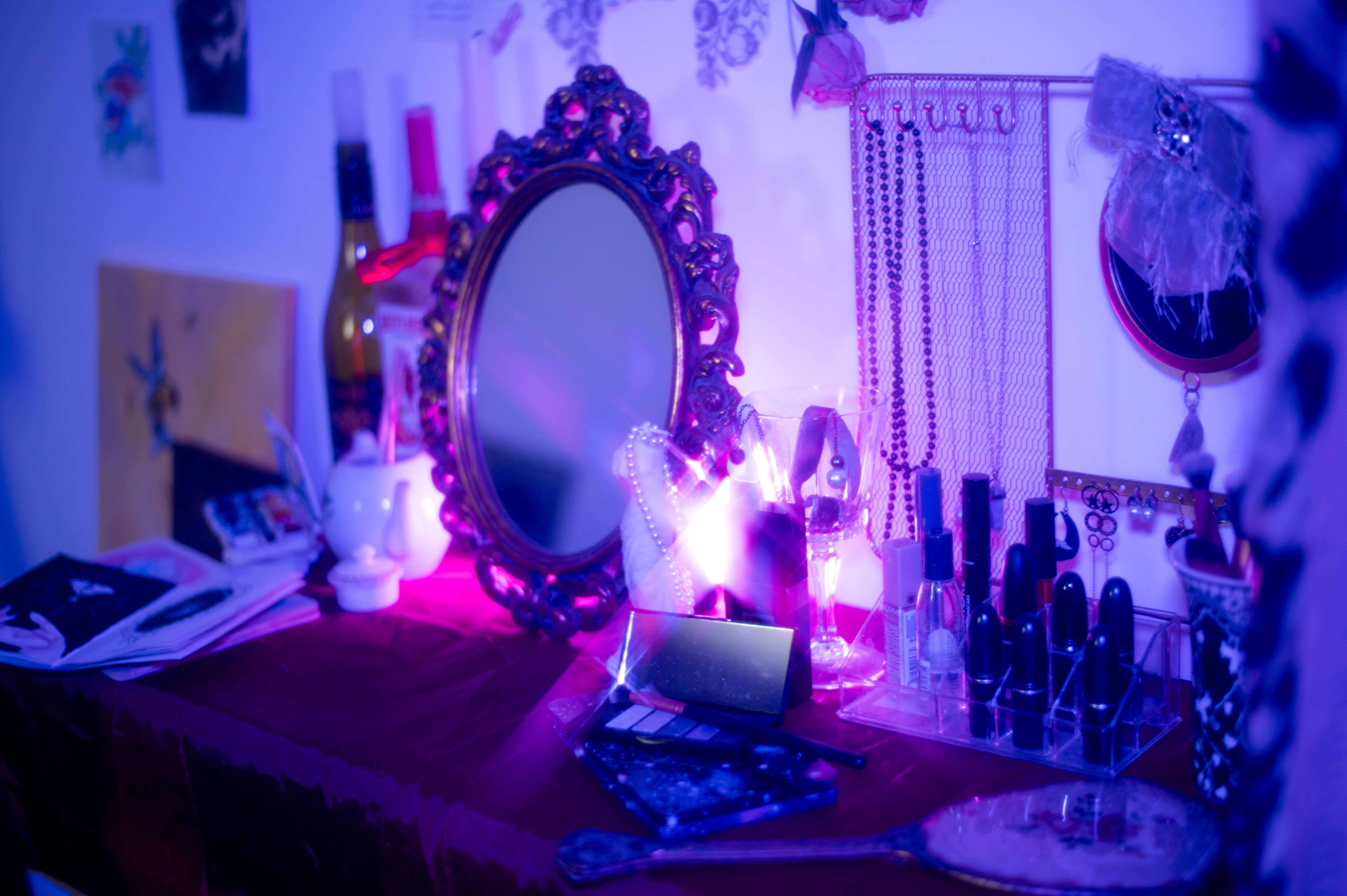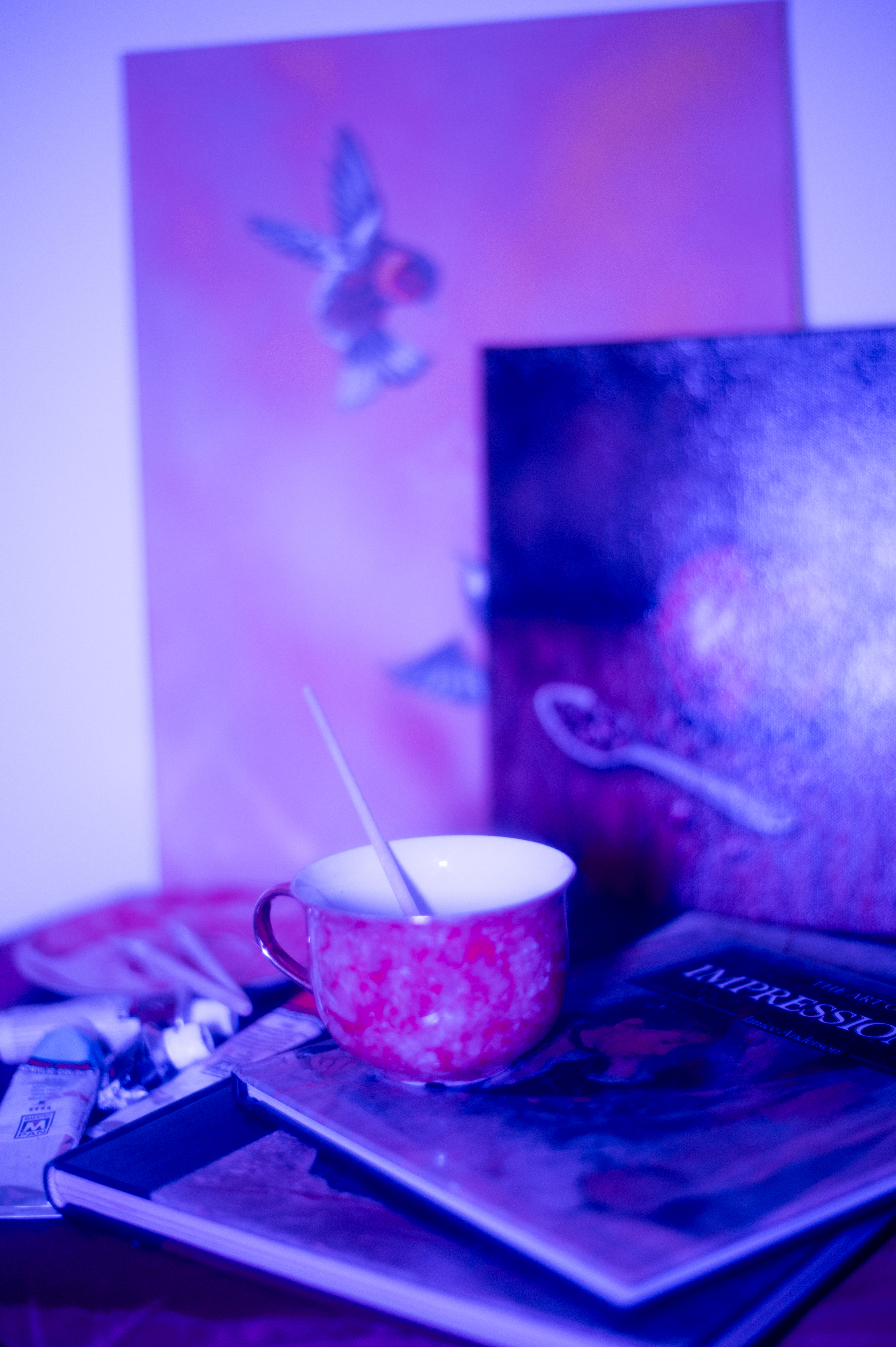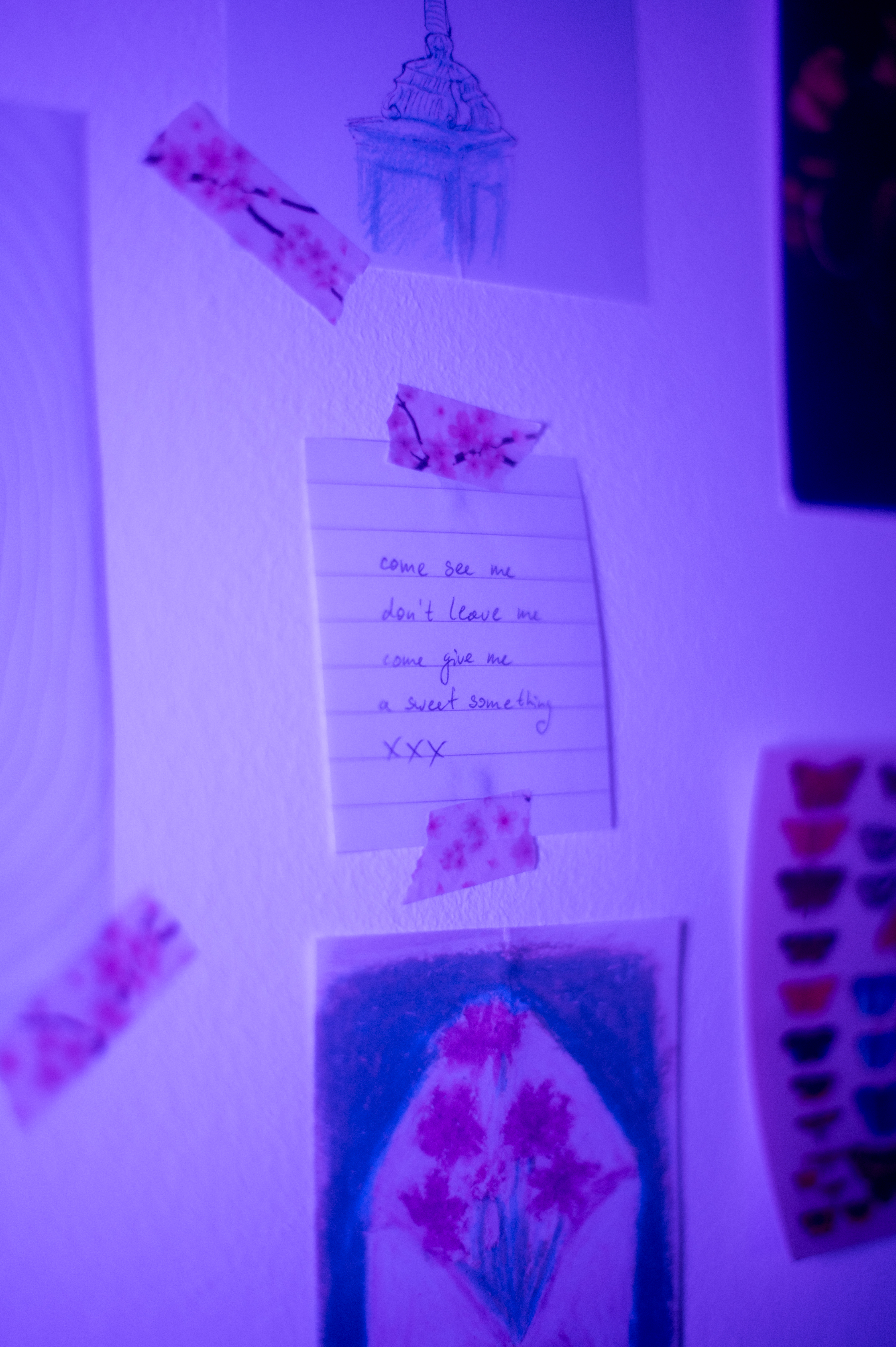 Her bedroom walls have drawings on the walls, tapestry above the bed, paintings on canvans on the floor, a vinyl collection (Including Hey, Honey by Pearll), candles in bottles, sketchbooks, flowers hanging upside down on the walls, vanily table that also serves as a desk because why not, scattered watercolour pallets mixed with eyeshadow pallets. She is the Art and the Artist.